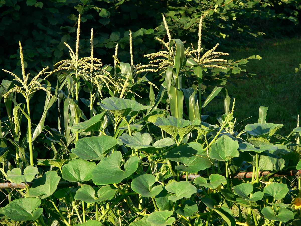 - Dieser Rhythmus wird noch unterstrichen durch den Kontrast der Blattstrukturen. Hier die großen runden Blätter des Kürbis, da die langen linealischen Blätter des Mais.