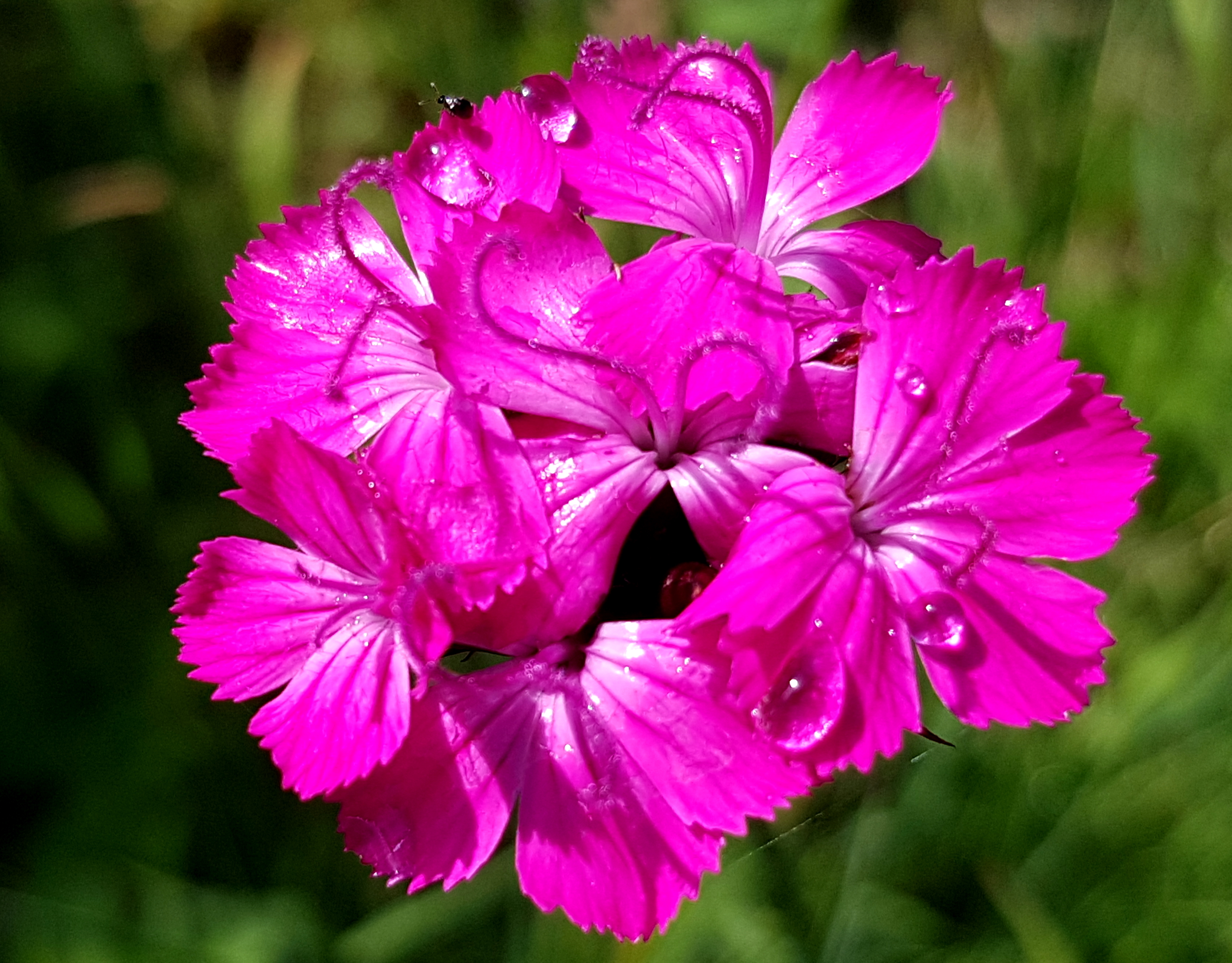 Zwei Nelken wachsen bei uns. Das eine ist die Heidenelke, die vom Mai bis in den Spätsommer blüht und von vielen Insekten und auch Schmetterlingen angeflogen wird.